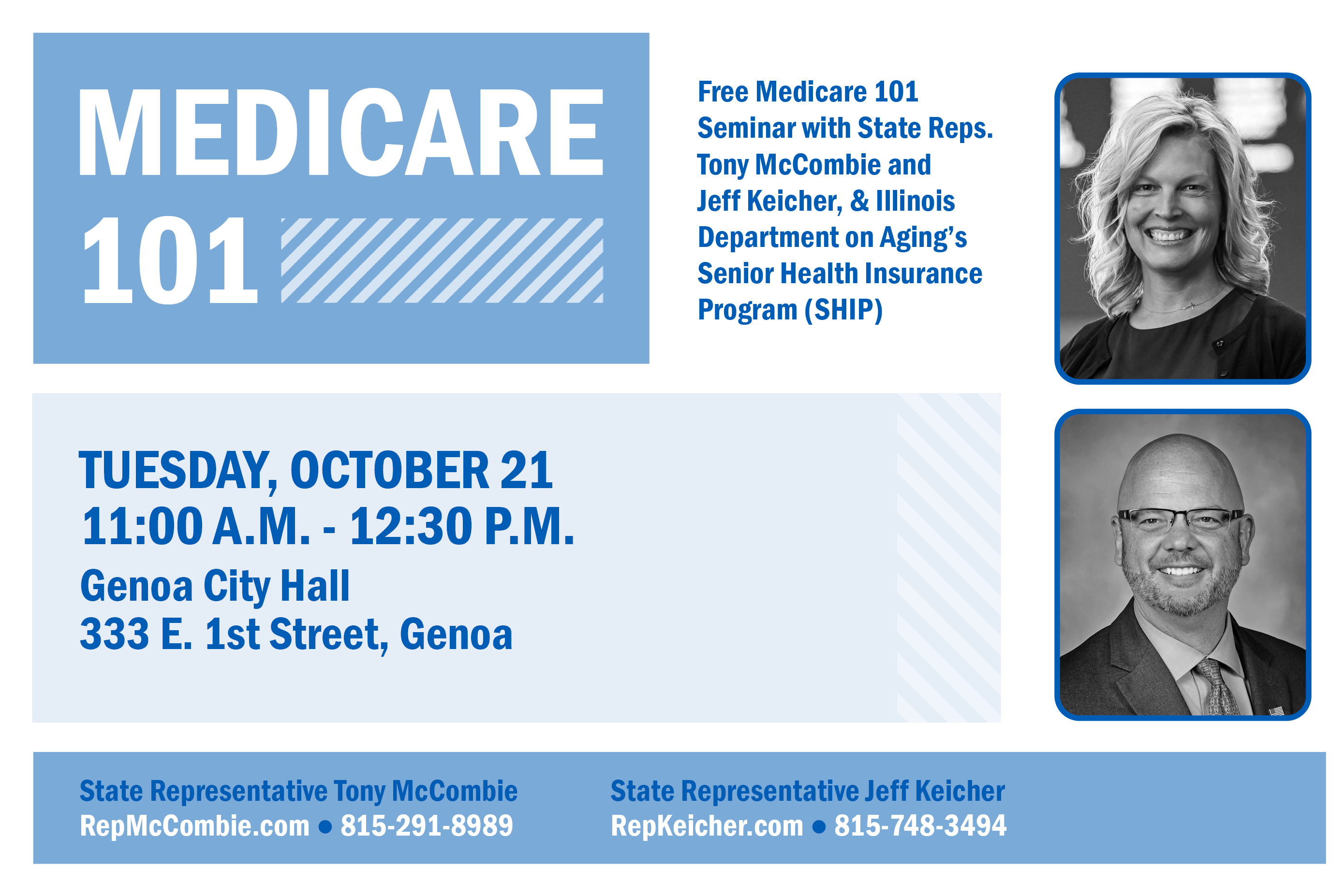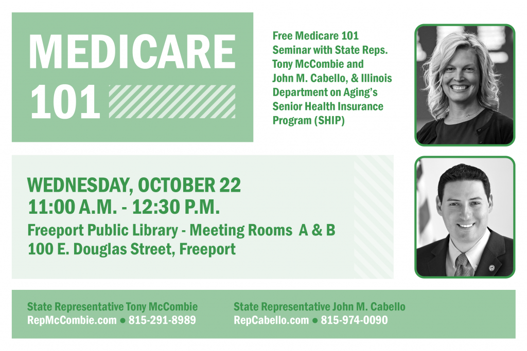 House Minority Leader Tony McCombie is pleased to announce two upcoming “Medicare 101” events, hosted in partnership with the Illinois Department on Aging’s Senior Health Insurance Program (SHIP) and State Representatives John Cabello (Machesney Park) and Jeff Keicher (Sycamore). These events are designed to help local seniors better understand the complexities of Medicare and will take place on the following dates and times: