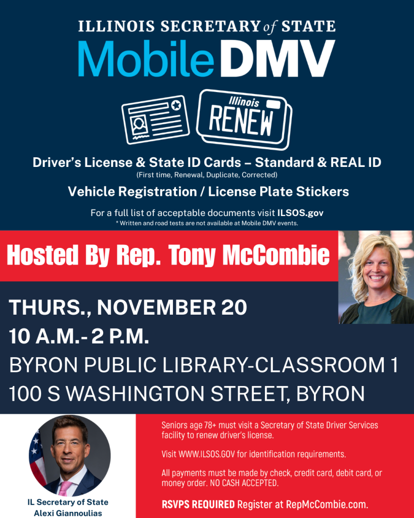 Illinois House Minority Leader Tony McCombie is partnering with the Illinois Secretary of State’s Office to bring DMV services directly to area residents. Leader McCombie is hosting an upcoming “Mobile DMV” event in Byron, giving residents the opportunity to access regular DMV services, like renewing their Illinois driver’s licenses, purchasing vehicle license plate stickers, and more. The upcoming event will be held:
