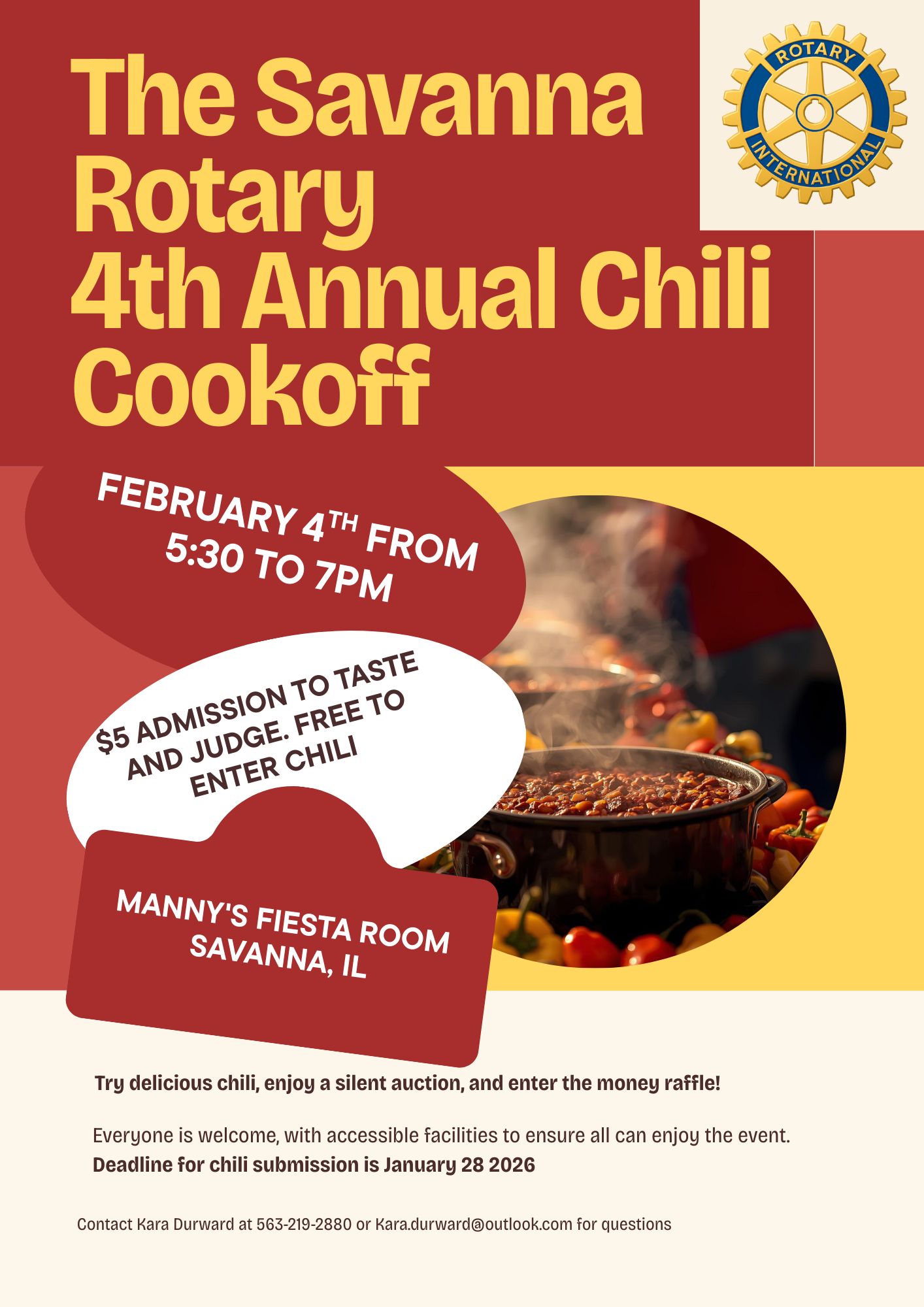 Join the 4th Annual Savanna Rotary chili cookoff. $5 to taste and judge chili's  Free to enter chili. Silent auction and a raffle drawings at 7