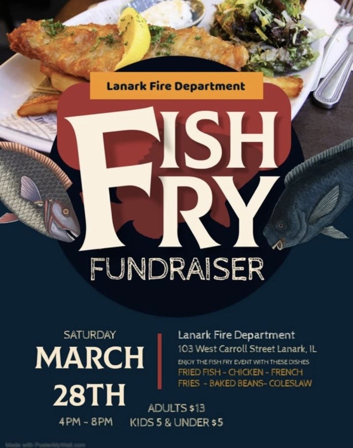 Join the Lanark Fire Department for a community Fish Fry Fundraiser. Enjoy a great meal while supporting your local fire department! The menu includes: Fried Fish Chicken French Fries Baked...