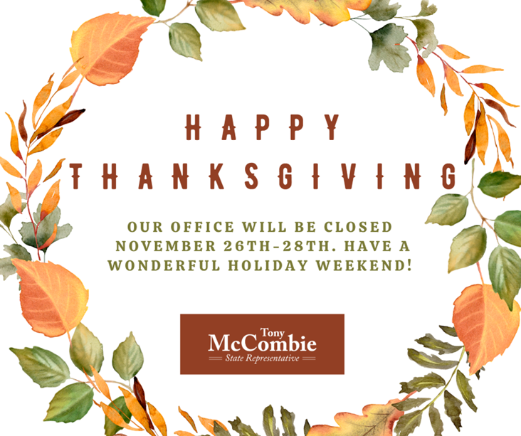 Illinois House Minority Leader Tony McCombie is sending holiday wishes to everyone this Thanksgiving: “I wish you a happy and healthy Thanksgiving. This season offers a meaningful moment to reflect…